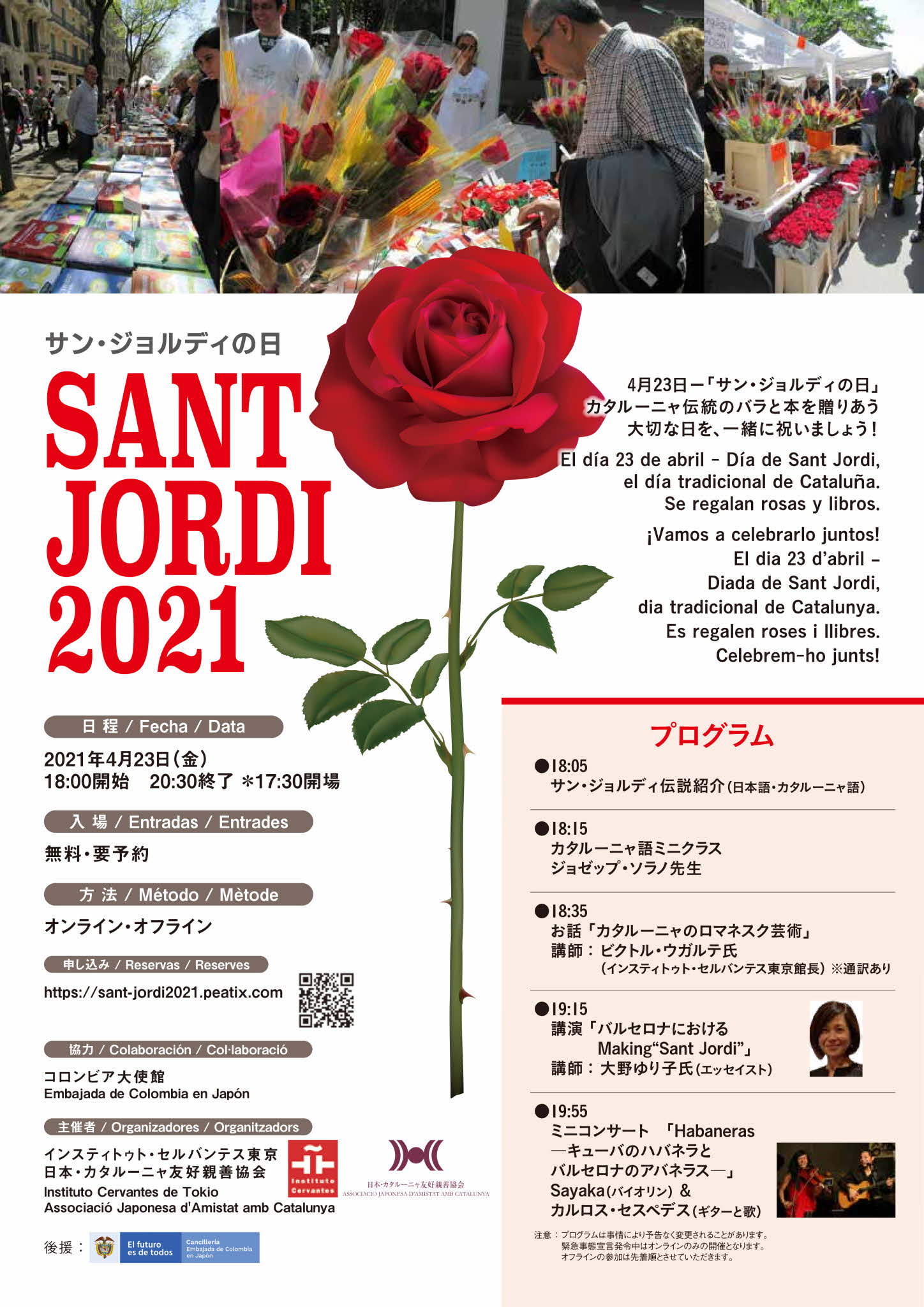 サン・ジョルディの日 2021年 サン・ジョルディの日 サン・ジョルディの日 2021.04.26 <終了しました> 4月23日 18:00~20:30 カタルーニャ伝統のバラと本を贈りあう 大切な日を、一緒に祝いましょう! 日時:4月23日(金)18時開始 20:30終了 *17:30開場 会場:オンライン、オフライン