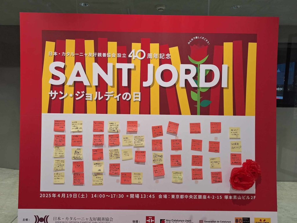 サン・ジョルディの日 2025年 サン・ジョルディの日 サン・ジョルディの日 2025.03.17 <終了しました> 4月19日(土) 14:00~17:30 カタルーニャ伝統のバラと本を贈りあう 大切な日を、一緒に祝いましょう! 日時:2025年4月19日(土)14:00開始 17:30終了(お好きな時間にご参加できます) 東京都中央区銀座4-2-15 塚本素山ビル2F ( 地下鉄「銀座」駅C6出口直結のビルです) 主催:日本・カタルーニャ友好親善協会 OLYMPUS DIGITAL CAMERA OLYMPUS DIGITAL CAMERA OLYMPUS DIGITAL CAMERA OLYMPUS DIGITAL CAMERA