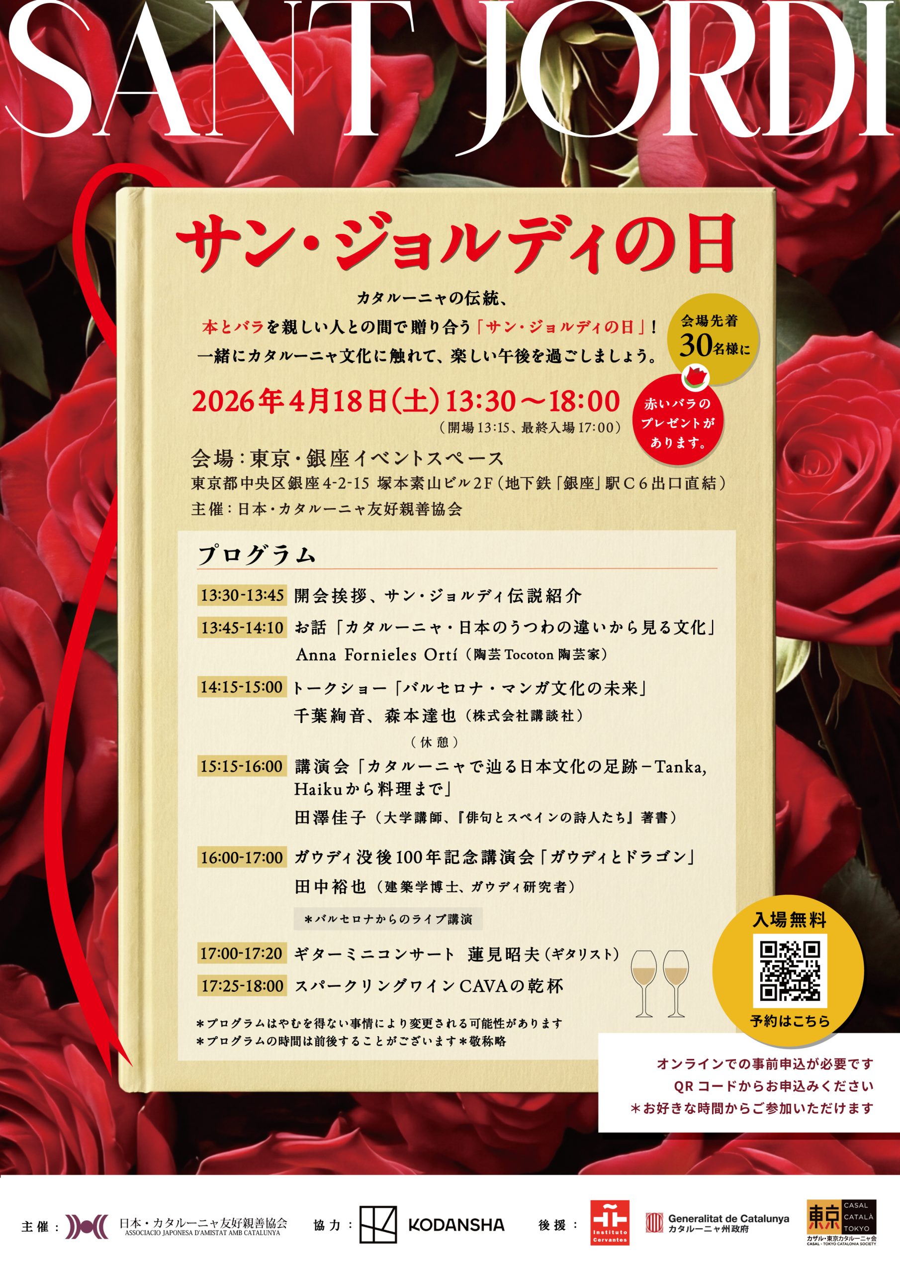 本とバラを贈りあうカタルーニャ伝統の日を祝うイベントを東京・銀座で開きます。一緒に土曜日の午後をお楽しみいただければ幸いです。